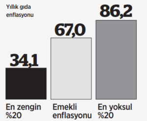 Yıllık gıda enflasyonu yüzde 48,57 olarak açıklandı. Ancak bu enflasyonun, halkın hissettiği gerçek enflasyonu yansıtmaktan oldukça uzak bir oran olması eleştirilere neden oluyor. TÜİK’in açıkladığı enflasyon verilerine göre yıllık olarak yüzde 48,5 artış gösteren gıda fiyatlarını, dar gelirli yurttaşlar yaklaşık iki kat fazla hissetti. DİSK-AR’ın TÜİK verilerinden yararlanarak yaptığı hesaplamaya göre emeklilerde gıda enflasyonu yüzde 67 oldu.