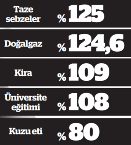 Kasım’da en büyük artış yüzde 5,10’la gıda ve alkolsüz içecekler grubunda gerçekleşti. Aylık gıda enflasyonu birçok ülkenin yıllık enflasyonun da üzerinde gerçekleşti. Taze sebze fiyatlarında yıllık fiyat artış yüzde 126 oldu.