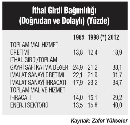 Başta üretimi ithal girdiye bağımlı olmaktan kurtarmak gerekir. Zafer Yükseler tarafından hesaplanan aşağıdaki tablo en son 2012 yılı girdi oranlarını veriyor. Bu tablo 2019 yılına yürütülürse dışa bağımlılığın daha yüksek olacağı açıktır.