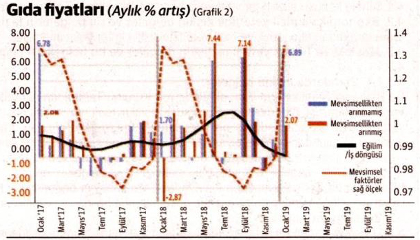 Enflasyonu analiz ederken gıda fiyatlarının bu mevsimsel özelliğini dikkate almak lazım. CENSUS X12 programını kullanarak bu ayrıştırmayı yaparsak, örneğin Ocak 2019’da gıda fiyatlarındaki aylık artış %6.89 olurken, mevsimsellikten arınmış rakam %2.07 olarak çıkıyor. Ocak 2018’de %1.70 karşılık % -2.87, 2017’de ise gene %6.78’e karşı %2.08 olmuş. Ocak ayı gıdada yüksek endekslerin gelmeye başladığı ilk ay. Bu hesaba göre şubat ve mart aylarında da bu artış (endeks bir kere ocak ayında yükseldiği için) %2’lere gerileyecek. Bir de meteoroloji, tabii afetler ve makroekonomik değişkenlerde kur patlaması, ani faiz artışı gibi arızi faktörlere bağlı olarak, üretimi aniden düşüren veya maliyetleri aniden artırıp piyasa fiyatlarına olumsuz yansıyan beklenmeyen, arızi "irregular" sıçramalar oluyor. Mesela, geçen sene, haziran ayında yukarıya doğru %7.14, ağustos ayında ise %0.18’le aşağıya doğru arızi dalgalanma içeren 2 ay yaşanmış. "TC Trend-Cycle-Eğilim/İş Döngüsü" bileşeni bu uç dalgalanmaları dikkate almıyor.