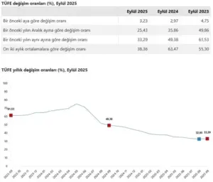 Türkiye İstatistik Kurumu (TÜİK) tarafından yapılan açıklamaya göre, TÜFE’deki (2003=100) değişim 2025 yılı Eylül ayında bir önceki aya göre yüzde 3,23 artış, bir önceki yılın Aralık ayına göre yüzde 25,43 artış, bir önceki yılın aynı ayına göre yüzde 33,29 artış ve on iki aylık ortalamalara göre yüzde 38,36 artış olarak gerçekleşti.