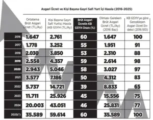 Kaynak ve açıklama: TÜİK, SBB ve ÇSGB verileri. 2024 ve 2025 yılı GSYH verileri OVP tahminlerine dayalıdır. KB GSYH 12’ye bölünerek aylığa dönüştürülmüştür. Asgari ücrete iki kaz zam yapılan yıllarda ortalama asgari ücret esas alınmıştır. 2025 yılı hedef ve tahminlere dayalıdır. 2025 yılı brüt asgari ücreti 2016 yılı baz alınarak önerilmiştir.