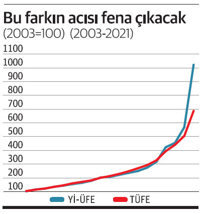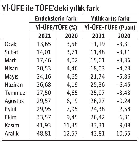 Geldik 2021 sonuna… Artık üretici fiyat endeksi 1022 düzeyinde. Tüketici fiyat endeksi ise 687. Aradaki fark tam yüzde 49.