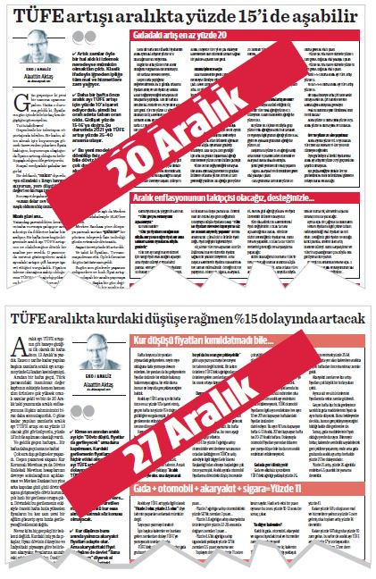 Türkiye 20 Aralık akşamı yeni bir finansal enstrümanla tanıştı, ayrıca o gün, sonradan belli oldu ki milyarlarca dolarlık döviz satıldı ve kur çok hızlı bir şekilde aşağı indi. Tüm kamuoyunda “Kur geriledi, fiyatlar da geriler” beklentisi doğdu. Ama kurdaki gerilemenin fiyatlara öyle bir anda yansıması söz konusu değildi. Bu gerilemeden hemen etkilenen kalem olan akaryakıtta ise devlet indirime vergi olarak el koyunca döviz kurundaki geri çekilmenin fiyatlara hiçbir etkisi olmayacağı anlaşıldı. İşte bunun üstüne 27 Aralık’ta kurdaki düşüşe rağmen aralık ayı TÜFE artışının yüzde 15 dolayında beklenmesi gerektiğine bir kez daha vurgu yaptım.