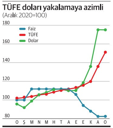 Üç göstergenin başlangıcı da 100; şimdi ise faiz 82, TÜFE 151, dolar 175.