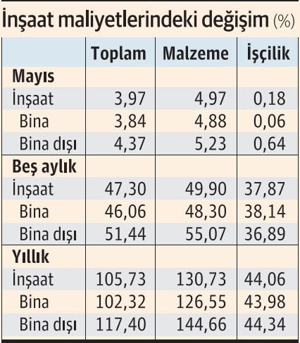 TÜİK tarafından dün açıklanan inşaat maliyet endeksinin mayıs verileri bugüne kadar anlatmaya çalıştığımızın gerçek oranlarla ortaya konulabilmesine fırsat verdi.