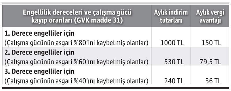 Vergi indirimi açısından, engelli çalışanın kendisi, bakmakla yükümlü olduğu eşi veya çocuğu engelli olan işçi, memur ve serbest meslek erbabı ayrıca basit usule tabi mükellefler bu kapsamdadır. Başka bir ifade ile engelli çalışanın vergi indiriminden faydalanabilmesi için İş Kanunu kapsamında çalışması gerekmez. Yine diğer nokta ise, çalışanın engelli olmaması ancak bakmakla yükümlü olduğu eşi ya da çocuğu engelli ise yine vergi indirim hakkı bulunmaktadır. (Kapıcılar, serbest bölgelerdeki iş yerlerinde çalışanlar, gemi adamları ile yurtdışında inşaatlarda çalışanların ücretlerinden vergi kesintisi yapılmadığı için vergi indirimi talep edilemez)