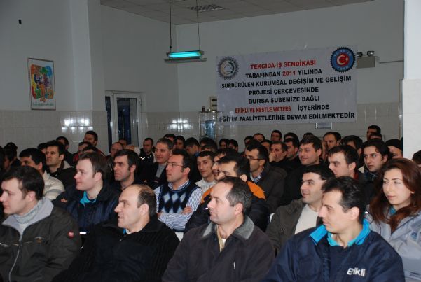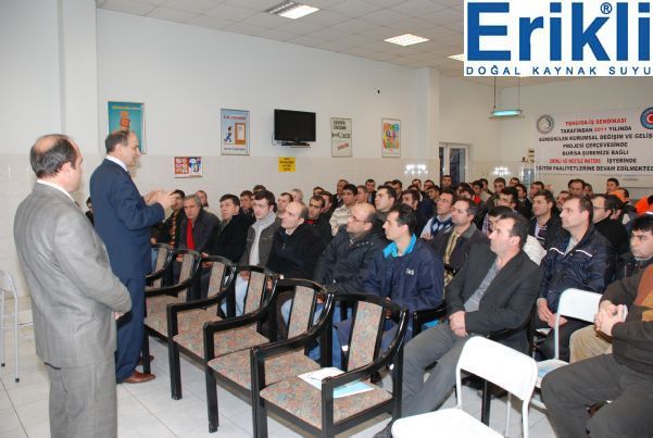 5 Şubat 2011 Cumartesi günü, Bursa Kestel’de kurulu bulunan ERİKLİ SU işletmesinde yaptığımız eğitim programına, her iki işletmede çalışan yaklaşık 250 üyemizin yanısıra, Genel EĞİTİM SEKRETERİmiz Sn. Mustafa AKYÜREK, Erikli Su ve Nestle Waters işletmelerinin yöneticileri Sn. Gülcan DOĞRU, Sn. Sami BULUT, Sn. Funda KARAGÖZ, Bursa Şube Başkanımız Sn. Zeki ERTÜRK ve Şube Yönetim Kurulu üyeleri ile sendikamızın EĞİTİM Uzmanı Sn. Tuba KURT da iştirak etti.