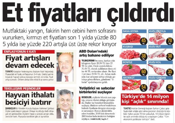 Bu arada, fiyatların ucuz olduğu söylenen Avrupa’da et ihtiyacının yüzde 70’inin domuz etiyle karşılandığım da hesaba katmak gerekiyor. Şahbazlar Et Yönetim Kurulu Başkanı Mehmet Şahbaz: "Bana göre ‘Fiyat patladı’ algısını bilerek veriyorlar. Etçiler speküasyon yapıyor, ‘Eti bulamıyoruz’ diyorlar. 4-5 yıl öncesi gibi ülkeye ithalatla ne olduğu belli olmayan eti getirmek istiyorlar. O süreçte hepsi zengin oldu bu etçilerin, üreticilerin hepsi battı. Etçiler de voliyi vurdu. İstedikleri gibi piyasada at oynattılar. Bu tamamen spekülatif bir artış. Önümüzdeki 1 ay içinde, nisan ayında etin fiyatı yaklaşık 1 TL gerileyecektir. İthalat isteyenlerin oyununa gelmemek lazım.