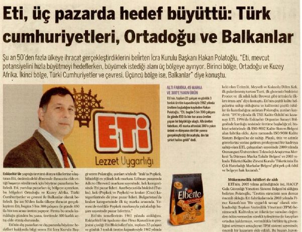 Şu an 50´den fazla ülkeye ihracat gerçekleştirdiklerini belirten İcra Kurulu Başkanı Hakan Polatoğlu, Eti, mevcut potansiyelini hızla büyütmeyi hedeflerken, büyümek istediği alanı üç bölgeye ayırıyor. Birinci bölge, Ortadoğu ve Kuzey Afrika. İkinci bölge, Türki Cumhuriyetler ve çevresi. Üçüncü bölge ise, Balkanlar diye konuştu.