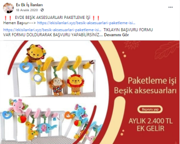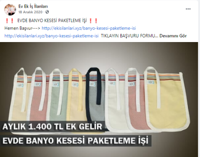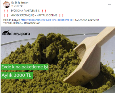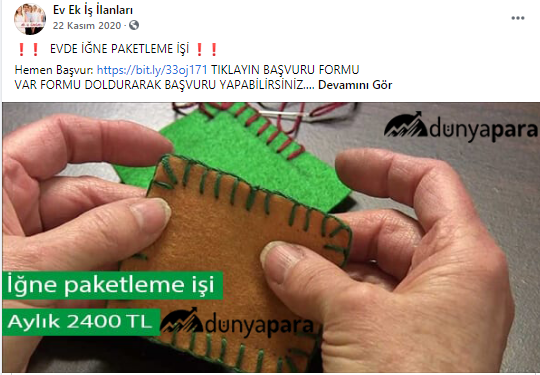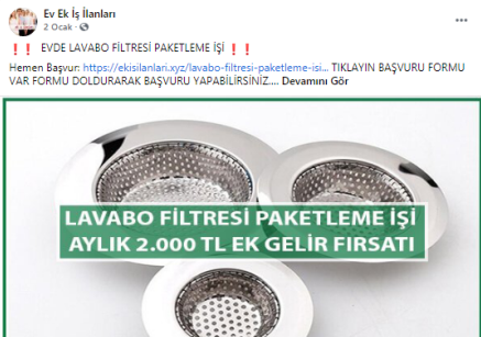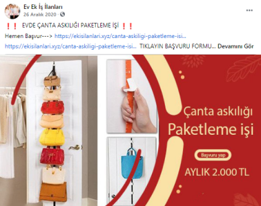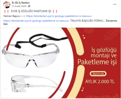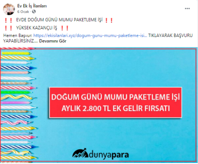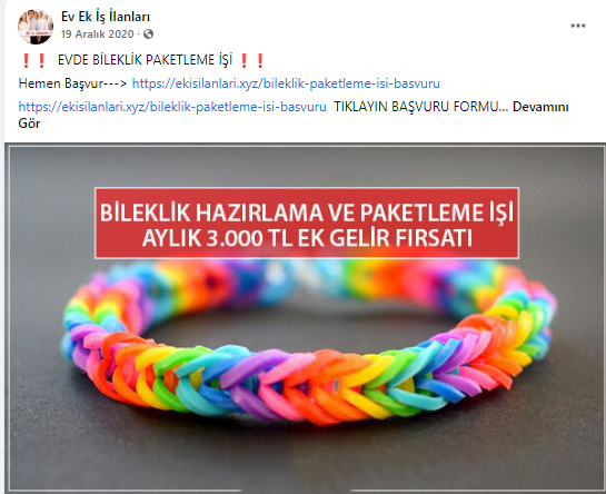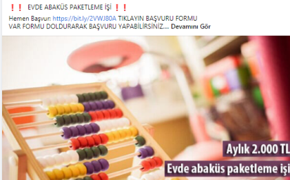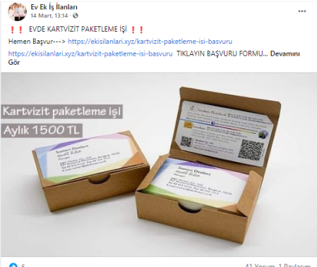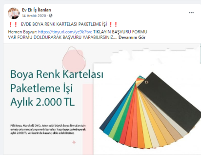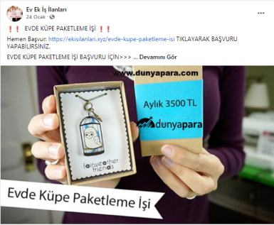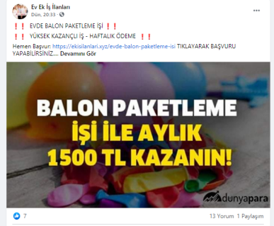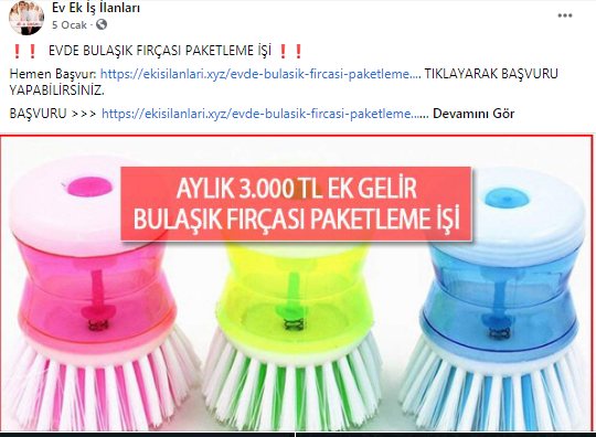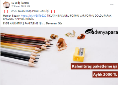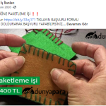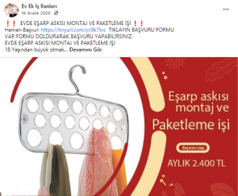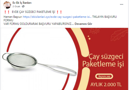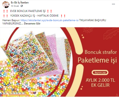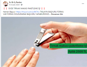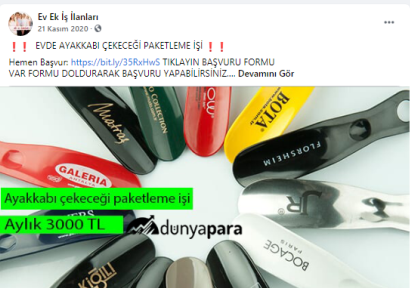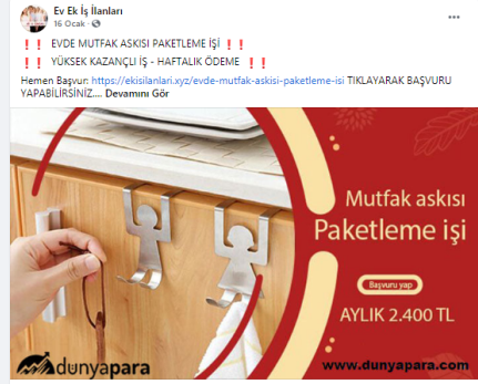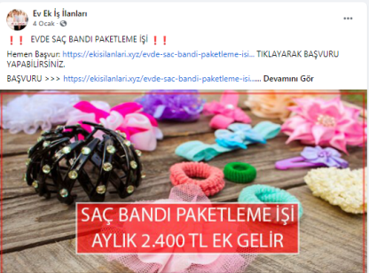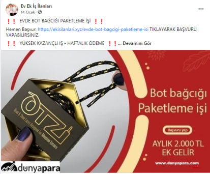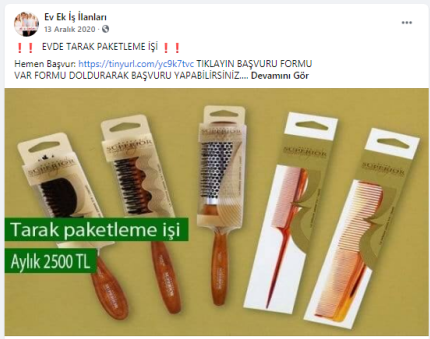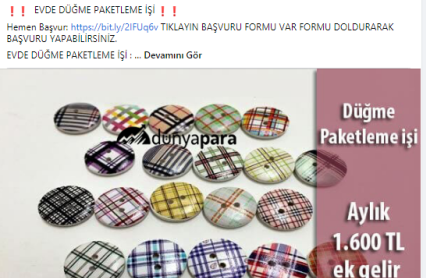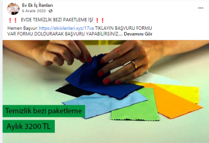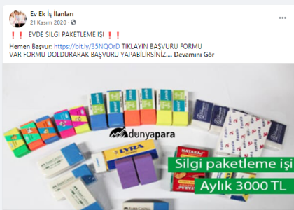 “Batman evde paketleme işi: Paketleyeceğiniz ürünlerde herhangi bir sınırlama bulunmamaktadır. Pipet, galoş, ağız maskesi, terlik, gözlük, önlük, mendil, tespih, kalem, silgi gibi birçok ürünün paketleme işi bulunmaktadır. Paketleme işlerinde de alacağınız ücretler paketleyeceğiniz ürünlerin adedine ve zorluğuna göre 1.200 TL ile 2.000 TL arasında değişmektedir.”