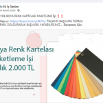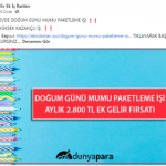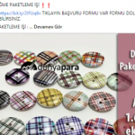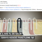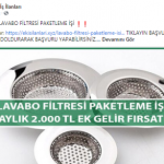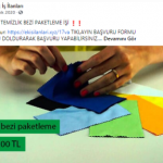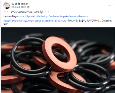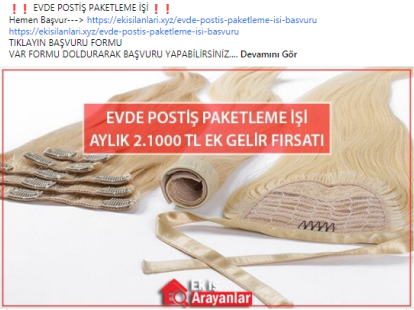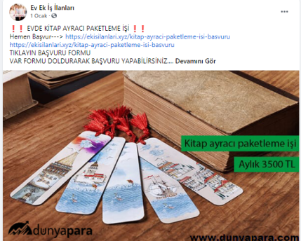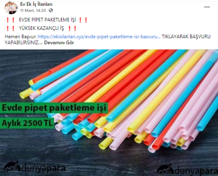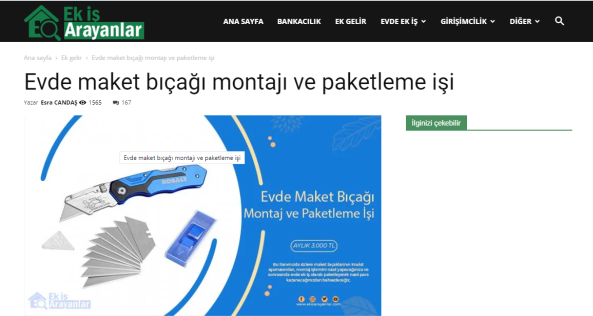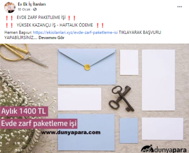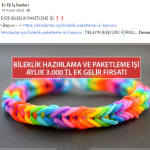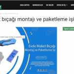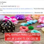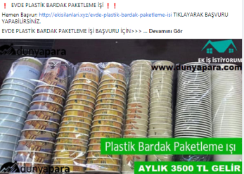 “Evde paketleme işi: Firmaların ürettikleri, satacakları ürünleri, evinizde, firmaların istedikleri şekilde paketleyerek güzel kazançlar elde edeceksiniz. Evde yapacağınız bazı paketleme işleri şunlardır: Telefon kılıfı paketleme işi, plastik bardak paketleme işi, plastik tabak paketleme işi, pipet paketleme işi, galoş paketleme işi, ağız maskesi paketleme işi, kalem paketleme işi, tespih paketleme işi, doktor eldiveni paketleme işi, çorap paketleme işi, pipet paketleme işi.”