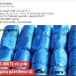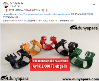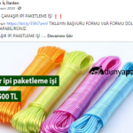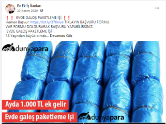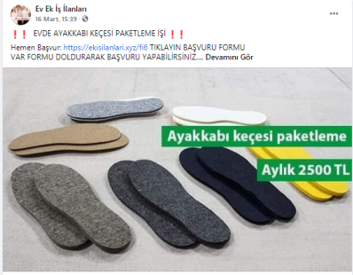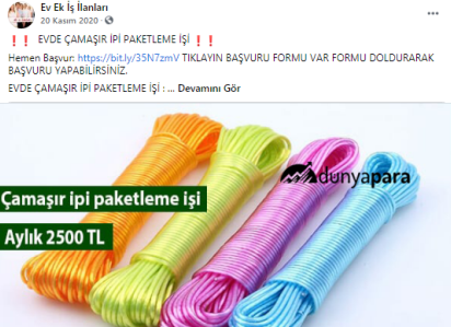 “Evde çorap paketleme işi: Sakarya da en çok üretilen tekstil ürünlerinin başında çorap yer almaktadır. Günde binlerce hatta yüz binlerce erkek, kadın ve çocuk çorapları üretilmektedir. Fabrikalarda üretilen bu çorapları eviniz ortamında etiketleyip şeffaf poşetlerine koyup paketleyerek günlük 50 TL kazanç sağlayacaksınız. Verilecek işlerin sayısı farklılık gösterecektir. Düzenli olarak çalışarak aylık 1.500 TL kazanç sağlamanız mümkün.”