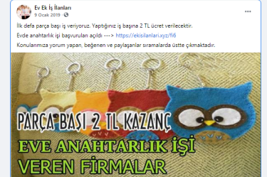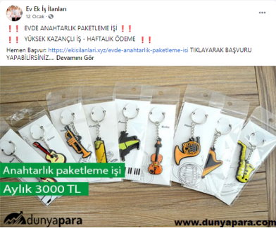 “Anahtarlık hazırlama ve paketleme işi: El yapımı anahtarlıklar şu sıralar çok sık kullanılmaktadır. Birçok figür, renk, şekil ve kişiye özel isimlerden oluşan anahtarlıkları evinizden hazırlayarak gelir elde edebilirsiniz. Firmaların size vereceği örnek modelleri, firmadan gelecek olan görevlilerin anlattığı şekilde hazırlayarak aylık 2.000 TL gelir sağlayabilirsiniz.”