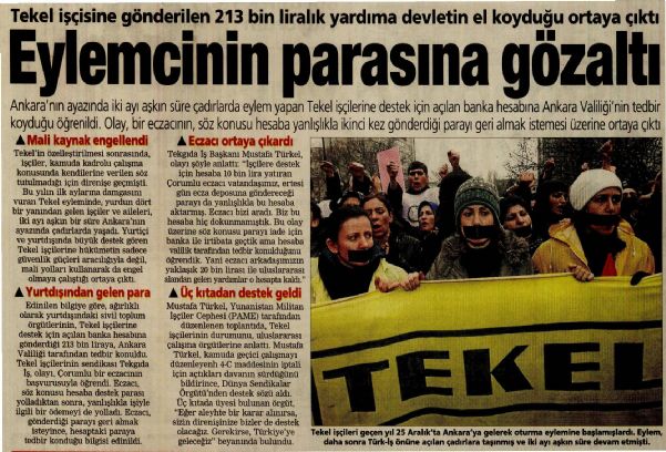 Tekel işçisine gönderilen 213 bin liralık yardıma devletin el koyduğu ortaya çıktı Eylemcinin parasına gözaltı Ankara’nın ayazında iki ayı aşkın süre çadırlarda eylem yapan Tekel işçilerine destek için açılan banka hesabına Ankara Valiliği’nin tedbir koyduğu öğrenildi.