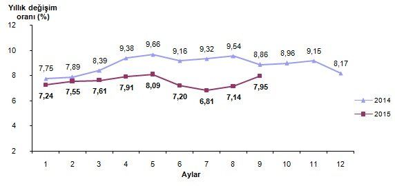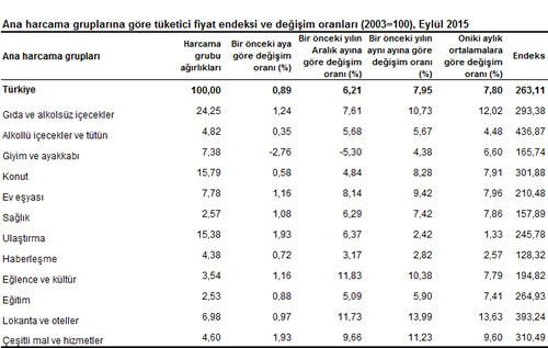 Ana harcama grupları itibariyle 2015 yılı Eylül ayında aylık en yüksek artış yüzde 1,93 ile ulaştırma ve çeşitli mal ve hizmetlerde oldu. Bununla birlikte, endekste yer alan gruplardan gıda ve alkolsüz içeceklerde yüzde 1,24, ev eşyasında yüzde 1,16 ve eğlence ve kültürde yüzde 1,16 artış gerçekleşti.