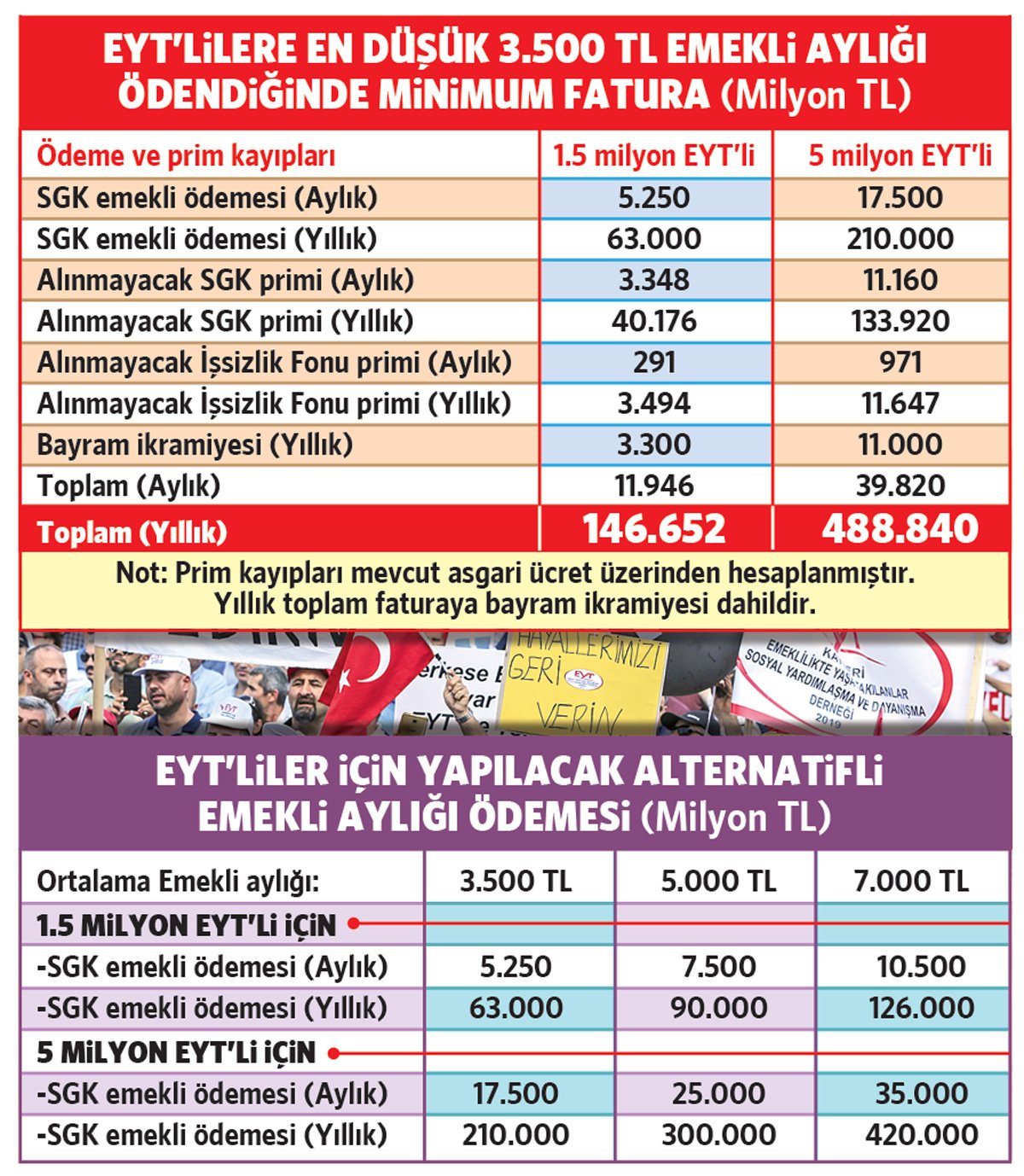 Çalışma Bakanı Vedat Bilgin, yaş şartının kaldırılması halinde ağustos itibarıyla ilk etapta 1.5 milyon kişinin emekliliğe hak kazanacağını, yılbaşına kadar bu sayının daha da artacağını söyledi. SÖZCÜ’nün yaptığı hesaplamalara göre, 1.5 milyon EYT’liye en düşük emekli aylığı olan 3 bin 500’er lira ödenmesi halinde aylık 5 milyar 250 milyon, yıllık 63 milyar lira para bulunması gerekiyor. Ayrıca 1.5 milyon EYT’linin halen asgari ücret üzerinden maaş aldıkları varsayıldığında dahi emekliye ayrıldıkları anda SGK yıllık 40.1 milyar lira işçi ve işveren prim geliri kaybına uğrayacak.