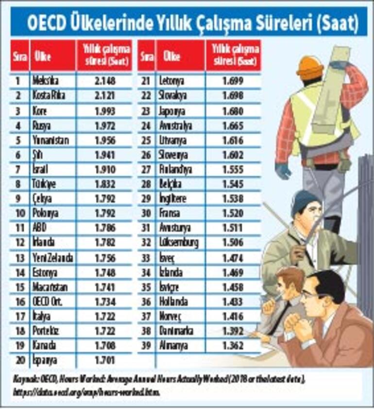Ekonomik Kalkınma ve İşbirliği TEŞKİLATı (OECD) verilerine göre, OECD ülkelerinde yıllık ortalama çalışma süresi 1.734 saat. 2.148 saatlik yıllık ortalama çalışma süresi ile Meksika, 2.121 saat ile Kosta Rika, 1.993 saat ile Kore, 1.972 saat ile Rusya ve 1.956 saat ile Yunanistan OECD ülkeleri içinde en yüksek çalışma sürelerinin olduğu ülkeler.
