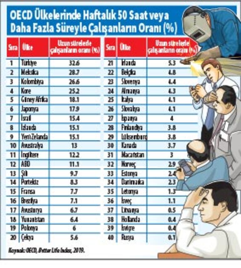OECD verilerine göre, Türkiye’de haftada 50 saat ve üzerinde çalışanların oranı yüzde 32.6, Meksika’da yüzde 28.7 ve Kolombiya’da yüzde 26.6. Dolayısıyla, Türkiye’de her üç çalışandan birinin çok uzun sürelerle çalışmakta olduğunu söylemek mümkün.