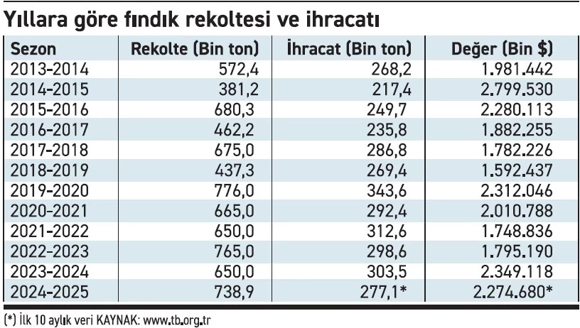 Geriye dönük sezonlara bakıldığında Türkiye’nin arz yönlü belirleyici gücünün devam ettiği ve üretim miktarının fiyatlar üzerinde büyük etkisi olduğu görülmekte. 2014-2015 sezonunda yaşanan rekolte düşüşüne rağmen ihracat gelirinin 2,8 milyar dolara çıkması, fındıkta arz-talep dengesinin fiyatlara etkisini net biçimde ortaya koydu. O yıl fındık rekoltesi 400 bin ton seviyelerine kadar gerilemiş, ancak arzın düşmesi fiyatları hızla yükseltmişti. Sonuç olarak ihracat miktarı 252 bin tonla sınırlı kalmasına rağmen, Türkiye fındıktan 2 milyar 799 milyon dolar döviz geliri elde etmişti.