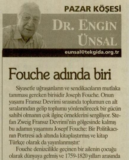 Siyasetle uğraşanlann ve sendikacılann mutlaka tanıması gereken birisidir Joseph Fouche. Onun yaşamı Fransız Devrimi sırasında toplumun en alt sıralanndan gelip toplumu yönlendirecek bir gücün sahibi olmanın çok ilginç örneklerini sergiliyor.