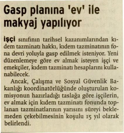İşçi sınıfının tarihsel kazanımlarından kıdem tazminatı hakkı, kıdem tazminatının fona devri yoluyla gasp edilmek isteniyor. Yeni düzenlemeye göre ev almak isteyen işçi ve emekçiler, kıdem tazminatı hesaplarını kullanabilecek. Ancak, Çalışma ve Sosyal Güvenlik Bakanlığı koordinatörlüğünde oluşturulan komisyonun hazırladığı taslağa göre işçilerin, ev almak için kıdem tazminatı fonunda toplanan tazminatlarının yarısını süreyi beklemeden çekebilmesinin koşulu 15 yıl olarak belirlendi.