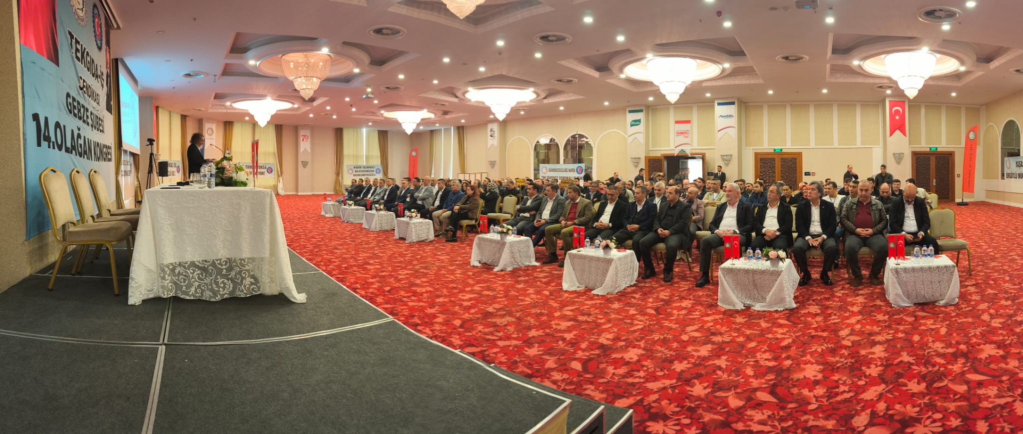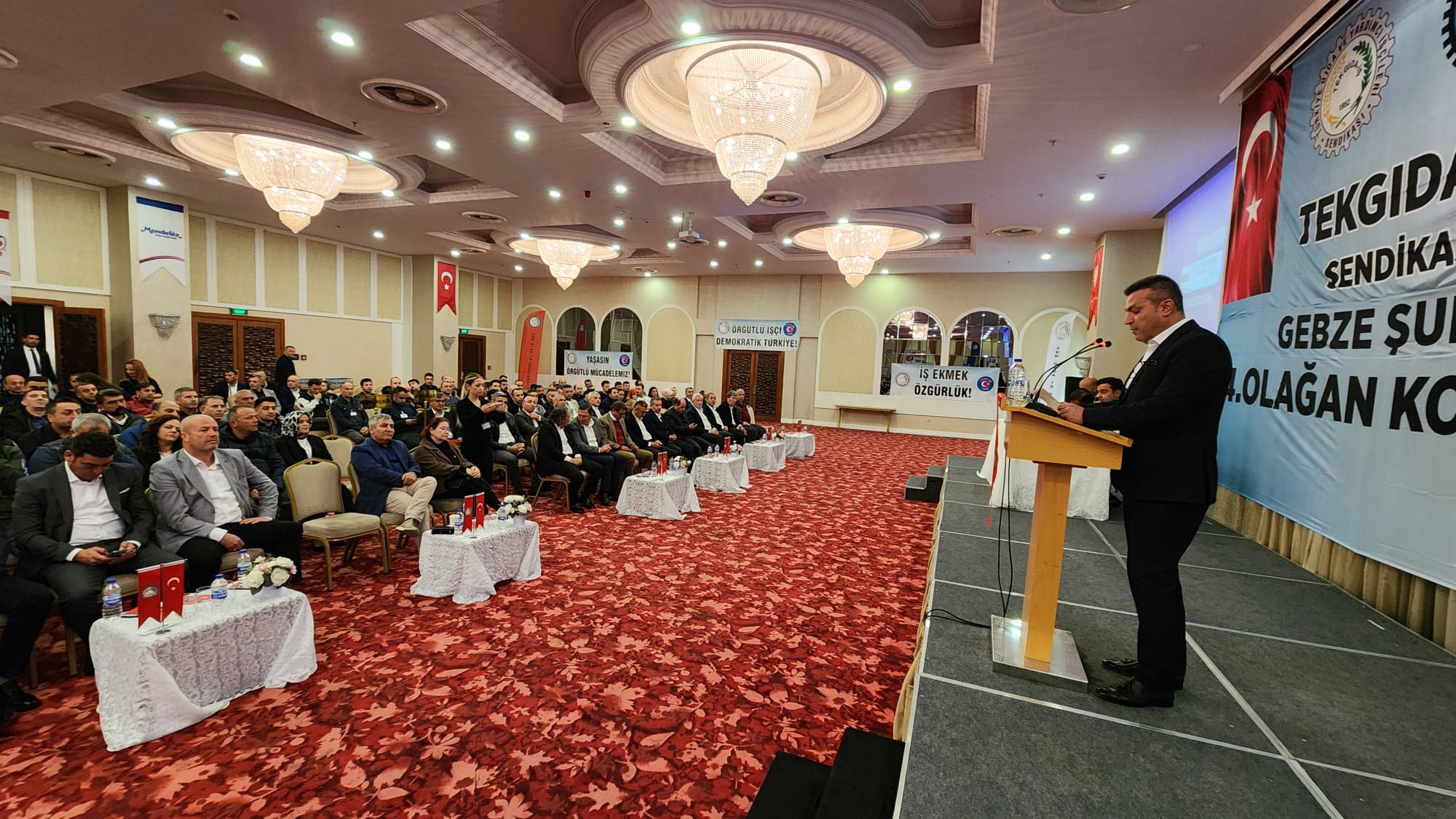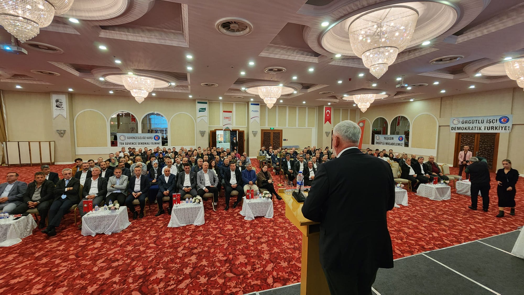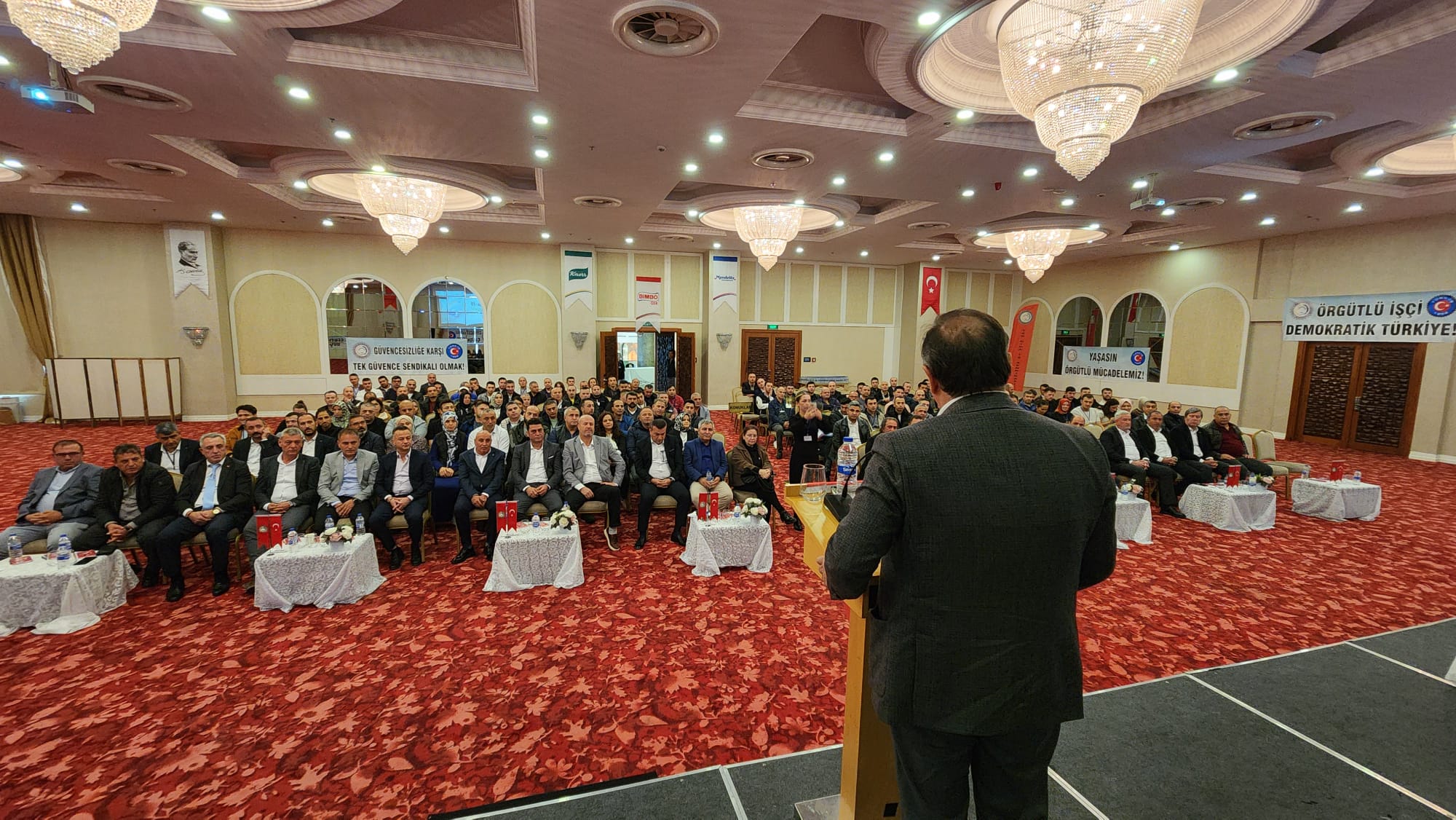– Değerli katılımcılar, hayat pahalılığı hepimizi her geçen gün ezerken Tekgıda-İş Sendikası Yönetim Kurulu olarak bizler yıllarca özel sektör işletmelerinde en zor koşullarda, vardiyalı sistemlerde çalışmış kardeşleriniz olarak sizleri çok iyi anlıyoruz. Bazen çok sıcak, bazen çok soğuk ortamlarda çalışmak kolay değildir. Bu ortamları görmeden ve bu ortamlarda çalışmadan özel sektör işçisini anlamak kolay değildir. Özel sektör işçisinin hiçbir zaman bekleme, görev bekleme lüksü yoktur. Savaş halindeki bir asker gibi sorumluluğuna odaklanır. Nefes aldığı sürece çalışma saatlerini aralıksız emeğiyle doldurmak zorundadır. Çünkü sürekli bantlar çalışır, kaybedeceğiniz birkaç saniye bile arkanızda iş yapan arkadaşınızın iş yükünü arttırır. Genellikle seri üretim yapan gıda işçisi bu şekilde çalışır. Kısa çay ve mola saatleri dışında birbirine selam verecek vakitleri bulamazlar. Gece vardiyalarından çıktığımızda evlerimize servislerde uyuyarak gideriz. Bir arkadaşımız sizi uyandırmazsa yüksek ihtimal evinizin adresini bile karıştırma ihtimaliniz vardır. İşte kısaca özel sektör gıda işçisinin hikayesi budur. Bu hikâyenin öznesi olmayan bu hikâyeyi bilemez ve anlaması da kolay değildir. Yönetici arkadaşlarımla birlikte sizlerin içinden gelmiş kardeşleriniz olarak üzerimizdeki sorumluluğu çok iyi biliyoruz. Bu sorumluluk çerçevesinde sizler için ve sizlerle birlikte gücümüz ölçüsünde en iyisini yapmaya çalışıyoruz.