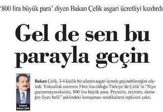 ‘800 lira büyük para’ diyen Bakan Çelik asgari ücretliyi kızdırdı: Gel de sen bu parayla geçin Bakan Çelik, 3-4 kişilik bir ailenin asgari ücretle geçinebileceğini söyledi. Yoksulluk sınırının 3 bin lira olduğu Türkiye’de Çelik’in "Niye geçinemeyeceksiniz, 800 lira büyük para. Peynirin, zeytinin, ekmeğin fiyatı belli" şeklindeki konuşması sendikaların tepkisini çekti.