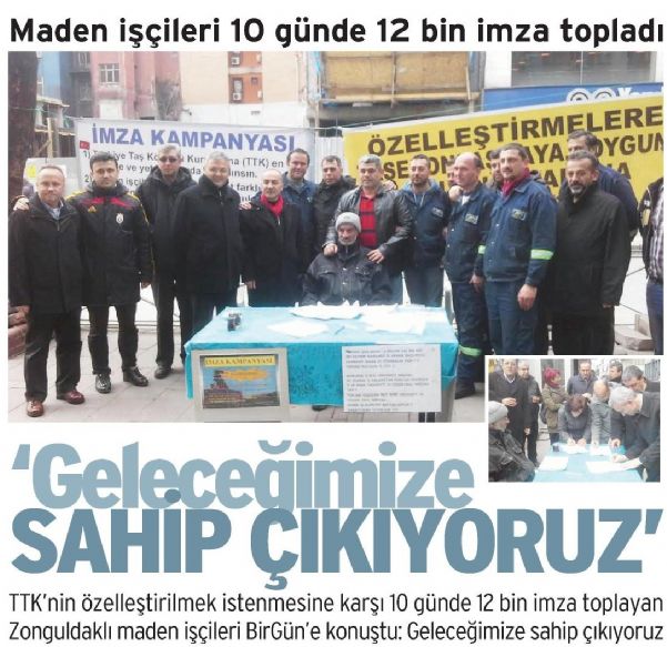İşte bu iddialar, Zonguldaklı maden işçilerini harekete geçirdi. Gazipaşa Caddesi’ndeki Vergi Dairesi Başkanlığı önünde masa açarak imza kampanyası başlatan işçiler, 10 gün gibi kısa bir sürede 12 bin imza topladı. İşçilerin amacı, 3 Nisan tarihine kadar 20 bin imza toplayarak kentte duyarlılığı artırmak ve madenlerin kapatılmasına kadar varacak sürecin önüne geçmek.