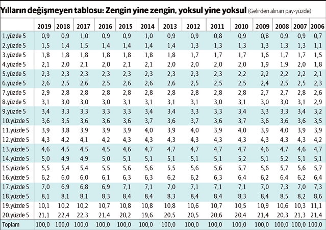 Yüzde 5’lik grupların toplam gelirden aldıkları pay yıldan yıla öyle kayda değer bir değişiklik göstermiyor. TÜİK’in bu çalışmasında 2006 yılına kadar gidilebiliyor ve on dört yılda neredeyse küçük iniş çıkışlar dışında her grubun toplam gelirden aldığı pay adeta sabitlenmiş gibi.
