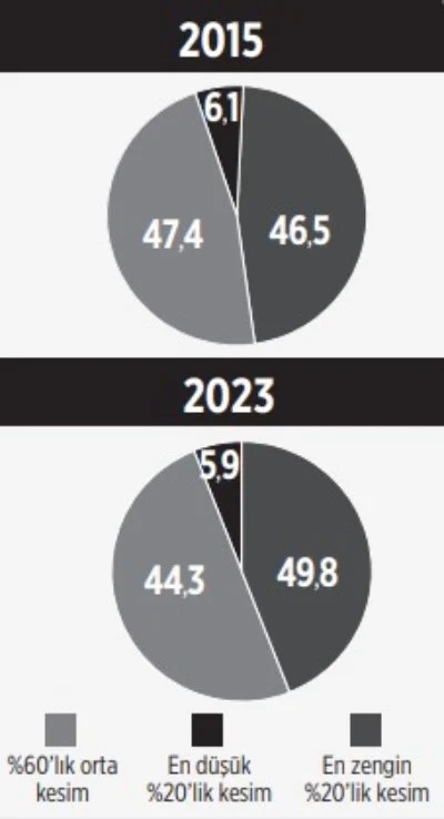 Türkiye İstatistik Kurumu’nun (TÜİK), 30 Ocak 2024’te açıkladığı “Gelir ve Yaşam Koşulları Araştırması” sonuçları Türkiye gelir dağılımındaki bozulmanın 2023’te de hızlanarak devam ettiğini ortaya koymuştu. En üst gelir grubundaki yüzde 20’lik nüfusun gelirden aldığı pay yüzde 50’ye yaklaştı. Bu grubun payı önceki yıla göre 1,8 puan artarak yüzde 49,8’e çıkarken, en düşük gelire sahip yüzde 20’lik grubun aldığı pay 0,1 puan azalarak yüzde 5,9’a geriledi. Verilere göre 2013-2023 döneminde; en üst ve en alt yüzde 5’lik gruplar arasındaki gelir farkı 22,8 kattan 26,6 kata; en üst ve en alt yüzde 10’luk gruplar arasındaki fark 13,6 kattan 15 kata; en üst ve en alt yüzde 20’lik gelir grupları arası fark ise 7,7 kattan 8,4 kata çıktı.