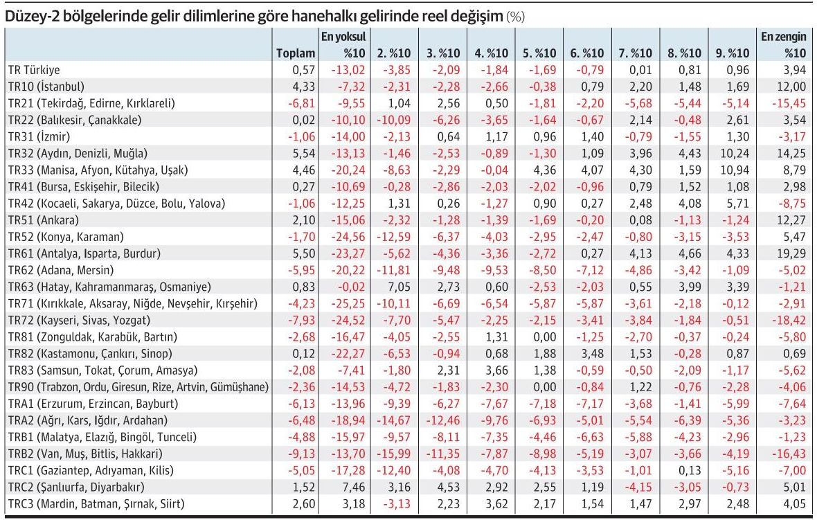 – En yoksul yüzde 10’luk dilimde yer alan hanelerdeki reel gelir kaybı TR71 (Kırıkkale, Aksaray, Niğde, Nevşehir, Kırşehir) bölgesinde yüzde 25.25, TR52 (Konya, Karaman) bölgesinde yüzde 24.56, TR72 (Kayseri, Sivas, Yozgat) bölgesinde yüzde 24.52, TR61 (Antalya, Isparta, Burdur) bölgesinde yüzde 23.27, TR82 (Kastamonu, Çankırı, Sinop) bölgesinde yüzde 22.27, TR33 (Manisa, Afyon, Kütahya, Uşak) bölgesinde yüzde 20.24 ve TR62 (Adana, Mersin) bölgesinde yüzde 20.22 gibi yıkıcı boyutlara ulaşıyor. Bu bölgelerdeki illerin Anadolu’nun en önemli sanayi ve tarım illeri olması ayrıca dikkat çekici bir nokta.