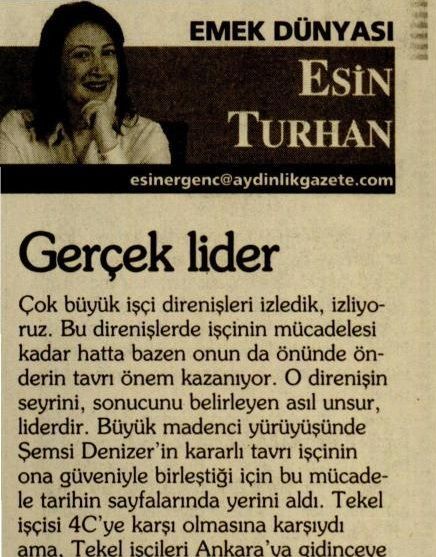 Çok büyük işçi direnişleri izledik, izliyoruz. Bu direnişlerde işçinin mücadelesi kadar hatta bazen onun da önünde önderin tavrı önem kazanıyor. O direnişin seyrini, sonucunu belirleyen asıl unsur, liderdir. Büyük madenci yürüyüşünde Şemsi Denizer’in kararlı tavrı işçinin ona güveniyle birleştiği için bu mücadele tarihin sayfalarında yerini aldı. Tekel işçisi 4C’ye karşı olmasına karşıydı ama, Tekel işçileri Ankara’ya gidinceye kadar hiç bir işçi 4C’li olmamış mıydı? O kadar çok oldu ki. Peki Tekel işçilerinin destanının yazılmasına liderin kararı değil de ne sebep oldu dersiniz? İster eleştirin ister onaylayın ama Mustafa Türkel, o mücadele sırasında nasıl bir işçi lideri olduğunu gösterdi. Herkes sendikacı olur ama lider seçilerek gelmekle olunmaz. O başka bir şekillenmeyle mümkün. Ta çocukluktan başlayan. Eğer, eylem alanında işçilerle oturup bekleseydi Mustafa Türkel, o koca koca mitingler, tam olarak olmasa da Türkiye’de ilk defa tüm konfederasyonların birleşerek yaptığı genel grevler olur muydu? Bazen karargahta kalmak ve olayları dışından gözlemlemek ve karar vermek daha doğrudur. Lider gerektiğinde komutan olabilmeli.