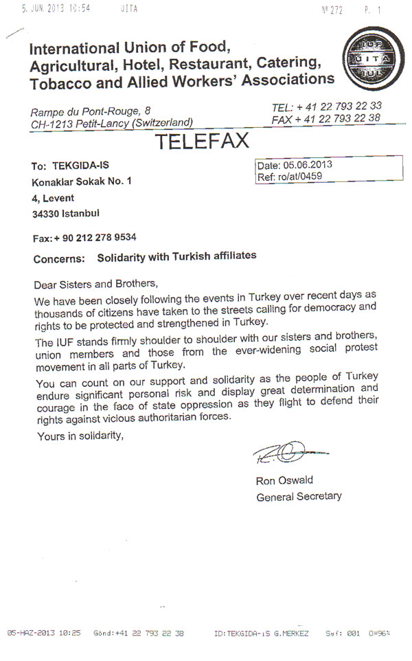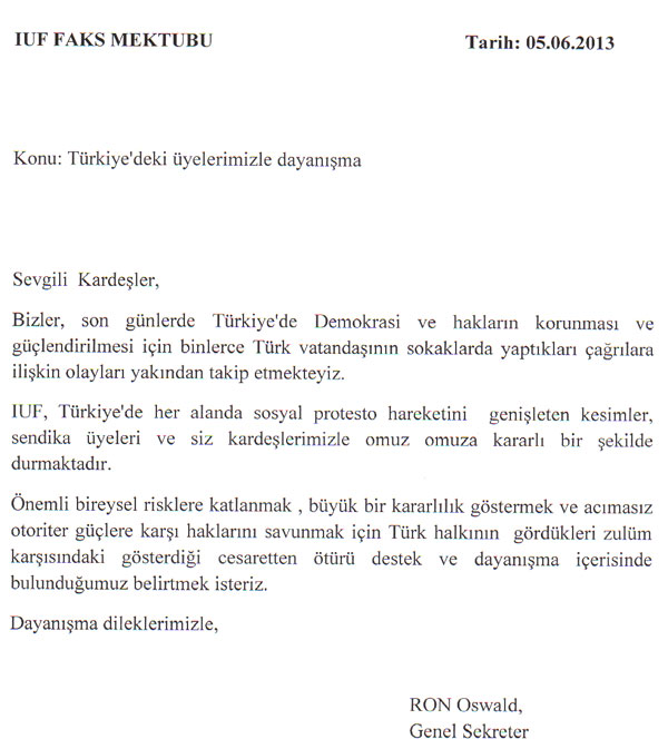 Üyesi bulunduğumuz Uluslararası Gıda İşçi Sendikaları Federasyonu (IUF), Genel Sekreter Ron OSWALD imzasıyla Sendikamıza gönderdiği yazılı mesaj metni