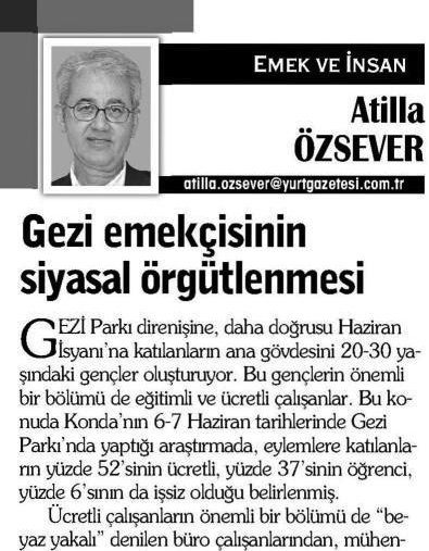 Bu konuda Konda’nın 6-7 Haziran tarihlerinde Gezi Parkı’nda yaptığı araştırmada, eylemlere katılanlann yüzde 52’sinin ücretli, yüzde 37’sinin öğrenci, yüzde 6’sının da işsiz olduğu belirlenmiş. Ücretli çalışanlann önemli bir bölümü de "beyaz yakalı"’ denilen büro çalışanlarından, mühendis, mimar, avukat, turizmci, bankacı gibi meslek mensuplarından oluşuyor.
