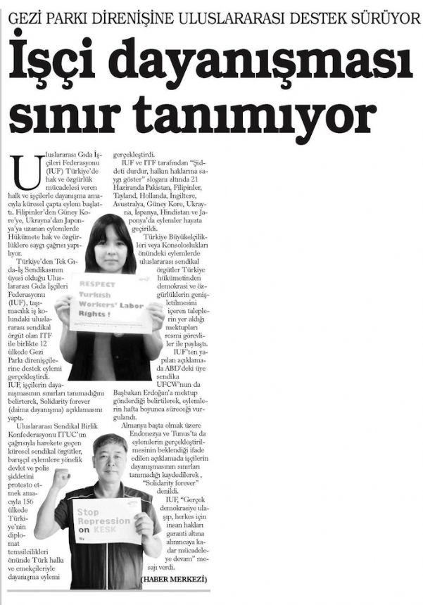 İşçi dayanışması sınır tanımıyor. Uluslararası Gıda İşçileri Federasyonu (IUF) Türkiye´de hak ve özgürlük mücadelesi veren halk ve işçilerle dayanışma amacıyla küresel çapta eylem başlattı. Filipinler´den Güney Kore´ye, Ukrayna´dan Japonya´ya uzanan eylemlerde Hükümete hak ve özgürlüklere saygı çağrısı yapılıyor.