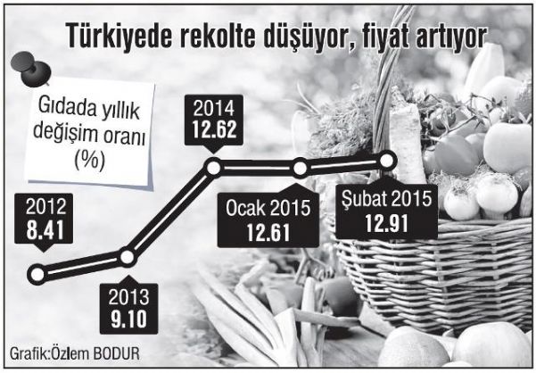 Birleşmiş Milletler Gıda ve Tarım Örgütü (FAO), Küresel Gıda Fiyatları Endeksi’nin şubatta 179.4 puana gerilediğini ve böylece endeksin 2010 Temmuzu’ndan bu yana en düşük seviyeye gerilediğini açıkladı. Türkiye’de ise 2005’ten sonra hızla daralan tarım arazilerinin üzerine 2007 ve 2014’te yoğun etkisi görülen don, sel, fırtına ve kuraklık gibi iklimsel değişimler tarım ürünlerinde rekolteyi düşürdü, gıda fiyatları, ona bağlı olarak da enflasyon arttı. Türkiye İstatistik Kurumu (TÜİK) 2014 Tüketici Fiyat Endeksi’nde (TÜFE) gıda ve alkolsüz ürünlerde on iki aylık ortalama yüzde 12.62 oldu. Ocakşubatta gıda fiyatları artışı yüzde 6.19 oldu. 12 ay ortalamasında gıda fiyatları artışı yüzde 12.91 oranında. Böylece dünyada gıda fiyatlarında düşme eğilimi görülürken Türkiye’de gıda fiyatları en çok artan ürünler listesinde lokanta ve otellerden sonra ikinci sırada yer aldı.