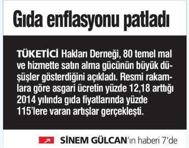 Gıda enflasyonu patladı AKP iktidarının gıda tarım ve ekonomi politikaları, son bir yılda tüketicinin gıda enflasyonunu patlattı. Tüketici Hakları Derneği, 80 temel mal ve hizmette tüketicilerin satın alma gücünün düştüğünü açıkladı. Resmi rakamlara göre asgari ücretin yüzde 12,18 arttığı 2014 yılında gıda fiyatlarında yüzde 115lere varan artışlar gerçekleşti.