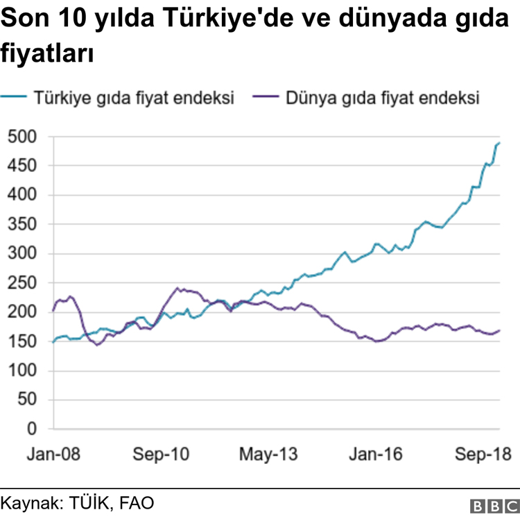 Türkiye’de gıda fiyatlarındaki artış küresel tablodan farklı bir yön izliyor. Birleşmiş Milletler Gıda ve Tarım Örgütü’nün her ay yayımladığı küresel gıda fiyatları endeksi neredeyse 10 yıldır yatay bir seyir izliyor.