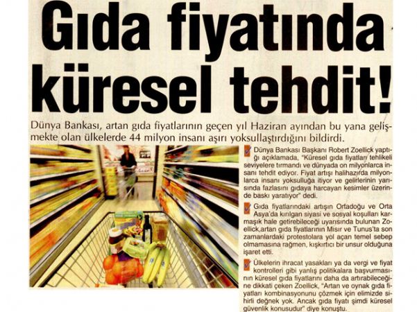 Gıda fiyatında küresel tehdit! WASHİNGTON Dünya Bankası, artan gıda fiyatlarının geçen yıl Haziran ayından bu yana gelişmekte olan ülkelerde 44 milyon insanı aşırı yoksullaştırdığını bildirdi. Dünya Bankası Başkanı Robert Zoellick yaptığı açıklamada, "Küresel gıda fiyatları tehlikeli seviyelere tırmandı ve dünyada on milyonlarca insanı tehdit ediyor. Fiyat artışı halihazırda milyonlarca insanı yoksulluğa itiyor ve gelirlerinin yarısında fazlasını gıdaya harcayan kesimler üzerinde baskı yaratıyor" dedi.