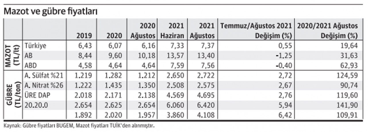 3-Tarım Bakanlığı verilerine göre 2019 yılında ortalama litre fiyatı 6 lira 43 kuruş olan mazotun litresi 2021 Ağustos ayında 7 lira 37 kuruş oldu. Son bir yıllık artış oranı yüzde 19,64.