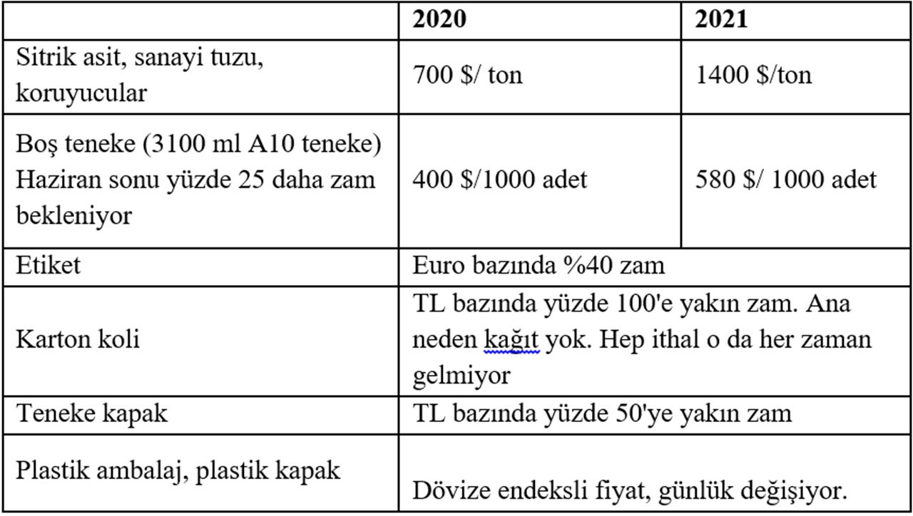 Sadece konserve sektörüne bakıldığında bile, dayanıklı gıda ürünlerinin maliyetinin yüzde 35 ile yüzde 60’ını ambalaj, etiket, koruyucu madde oluşturuyor. Bu oran son zamlardan önce yüzde 25-45 aralığındaydı. Yani 10 liraya mal edilen bir konservenin ürün ambalajına bağlı olarak 3,5 ile 6 lirası ambalaj, koruyucu madde, etiket gibi malzemeler oluşturuyor.