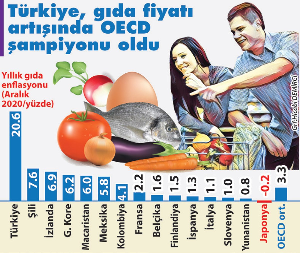 Tüm dünyada salgının ekonomileri tahrip etmesi nedeniyle sıfıra yakın enflasyonun yaşandığı bir ortamda Türkiye, tüketici ve gıda fiyatlarındaki artışla şampiyon olmayı başardı. Aralık 2020 itibarıyla yılda yüzde 14.6’ya ulaşan tüketici ve yüzde 20.6’ya ulaşan gıda fiyatları artışıyla Türkiye gelişmekte olan ülkeler arasında Arjantin’in ardından ikinci sıraya yerleşirken, Ekonomik İşbirliği ve Kalkınma Teşkilatı (OECD) ülkeleri arasında lider konumuna yükseldi.