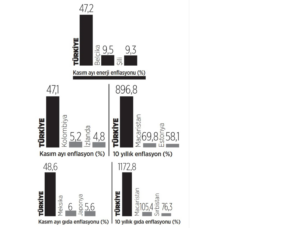 TÜFE’de de benzer durum ortaya çıktı. Kasım ayında TÜFE Türkiye’de yüzde 47,1 ile en yüksek seviyede kalırken Kolombiya yüzde 5,2 ile ikinci sırada, İzlanda ise yüzde 4,8 ile üçüncü sırada yer aldı. OECD ortalaması ise yüzde 4,5 oldu.