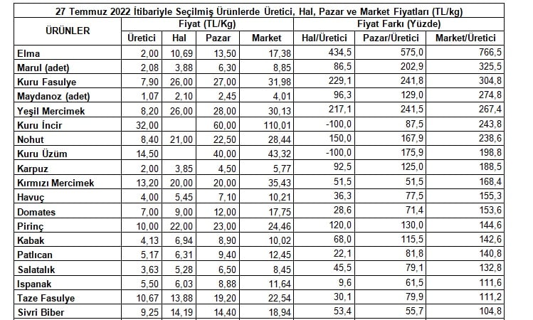 Temmuz ayında üretici ile market arasındaki fiyat farkı en fazla yüzde 766,5 ile elmada görülürken, bunu yüzde 325,5 ile marul, yüzde 304,8 ile kuru fasulye, yüzde 274,8 ile maydanoz, yüzde 267,4 ile yeşil mercimek, yüzde 243,8 ile kuru incir ve yüzde 238,6 ile nohut takip etti.