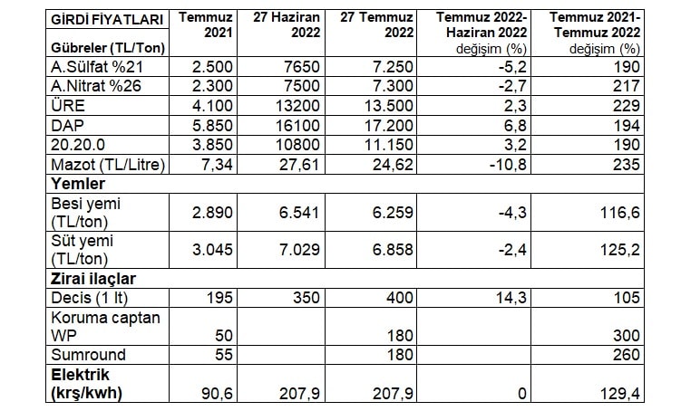 Temmuz ayında, Haziran ayına göre gübre fiyatları amonyum sülfatta yüzde 5,2 ve kalsiyum amonyum nitratta yüzde 2,7 azalırken, DAP gübresinde yüzde 6,8, 20.20.0 kompoze gübresinde yüzde 3,2, üre gübresinde yüzde 2,3 artış gösterdi.