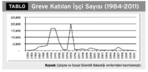 1987,1988 ve 1989’da yıllık ortalama 30 bin işçinin katıldığı grevlere 1990 ve 1991 yıllarında ortalama 160 binin üzerinde işçi katıldı. 1995 yılında ise greve katılan işçi sayısı 200 bine yaklaştı. Bu Türkiye çalışma ilişkileri tarihindeki en yüksek grevci işçi sayısıdır. 2000’li yıllarda ise greve katılan işçi sayısı yıllık ortalama binlerle ifade edilmektedir. 2001 yılında yaklaşık 10 bin işçi greve katılırken bu sayı zamanla giderek azalmış, 2010 ve 2011 yıllarında binin altına düşmüştür. 2011 yılında greve katılan işçi sayısı sadece 557’dir.