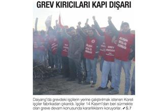 Daiyang’da 14 Kasım’da başlayan grevde, grevin ildnci gününden itibaren grevci işçilerin yerine işçi çalıştırıldığına ilişkin tespit yapılması için başvuru yapılmış, ancak önceki gün yapılan eyleme kadar bu talepler dikkate alınmamıştı. Örgüdenmenin ille aşamalarından itibaren sendika düşmanı tutumuyla dikkat çeken Daiyang patronu, grevin başlamasının ardından da grevi kırmak için pek çok girişimde bulunmuştu. Haber Merkezi DİSK’ten Birleşik Metal-İş’e destek açıklaması DİSK Genel Başkanı Erol Ekici, Daiyang patronunun yasadışı tutumlarını ve grevcilere yapılan saldırıyı kınayan bir açıklama yaparak, "Güney Koreli işverenlerin, örgütlenme ve yetki sürecinde işçilerin sendikal haklarını engellemeye yönelik sergiledikleri tutum, toplu iş sözleşmesi döneminde de devam etti ve grev sürecinde ise yasadışı bir boyuta sıçradı" dedi.
