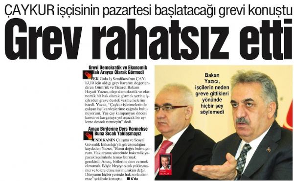 TEKGıda İş Sendikasının Çaykur için almış olduğu grev kararındaki amacın birilerine ders vermek olduğunu belirten Bakan Hayati Yazıcı, Ben Çaykur’ da çalışan işçi kardeşlerime çağrıda bulunuyorum. "Hiç kimse heyecanla beklediğimiz yaş çay kampanyası dönemi başında kaosa, çekişmeye, kargaşaya yol açacak, insanlarımızı sıkıntıya düşürecek bir eyleme destek vermemeleri gerektiğini düşünüyorum. Buna seyirci kalınamaz. Elbette taktir kendilerinindir. Süreci takip ediyorum. Yapılması gerekenleri yapıyorum. Tek dediğimiz yön neyse o icraati yaparız" dedi.