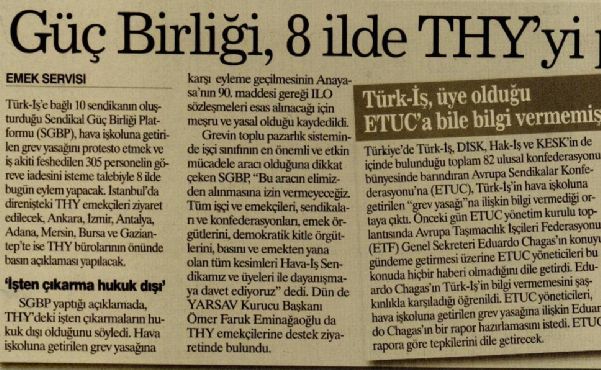 Türkiye’de Türk-İş, DİSK, Hak-İş ve KESK’in de içinde bulunduğu toplam 82 ulusal konfederasyonu bünyesinde banndıran Avrupa Sendikalar Konfederasyonu’na (ETUC), Türk-İş’in hava işkoluna getirilen "grev yasağına ilişkin bilgi vermediği ortaya çıktı,
